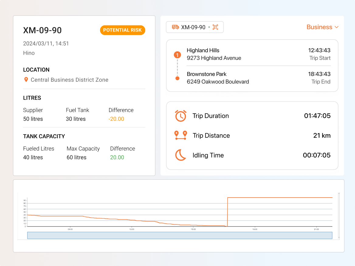View accurate fuel level data in graph form and get alerts on potential siphoning or leakage based on abnormal drops in fuel level that cannot be explained by regular fuel consumption.